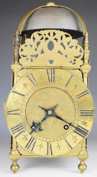 Antique style brass lantern clock, named to dial Jos Pickering Lutterworth N 146, the two train movement striking on the bell within the top, overall height 32.5cm