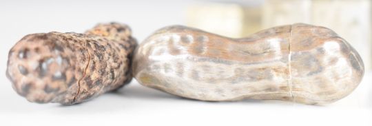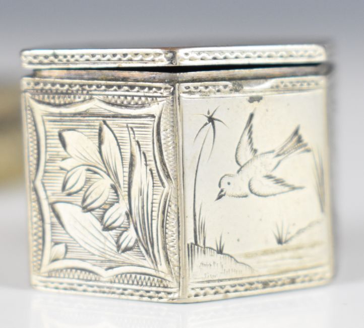 Hexagonal unmarked silver box with engraved decoration of ship beside a castle, novelty Mexican silver pot formed as a peanut, haematite or similar sample and a small rectangular silver plated box, length of peanut 5cm