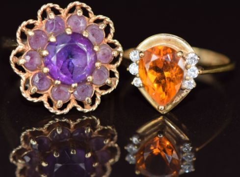 Two 9ct gold rings, one set with a pear cut citrine and diamonds and the other a cluster of amethysts, 6.7g, sizes J & L