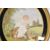 19th century needlework or tapestry picture of a lady in a garden with a wheelbarrow of flowers, with her hat on the ground and dog beside her, in gilt frame, overall height 32cm