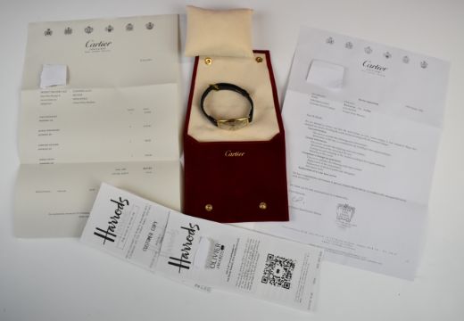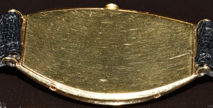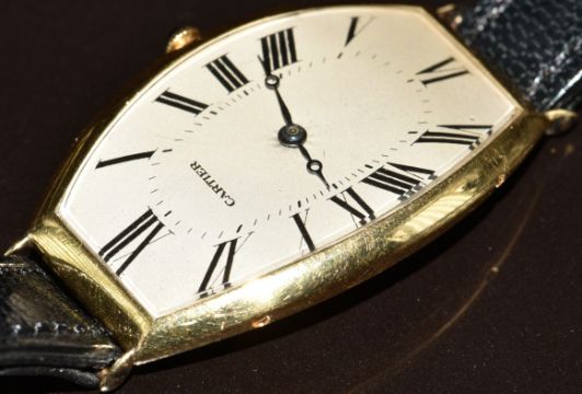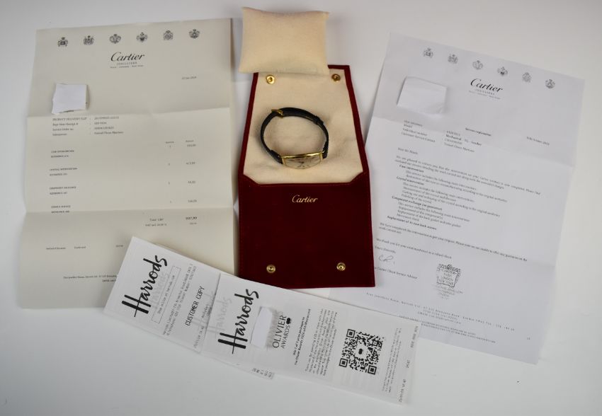 Cartier Tonneau 18ct gold gentleman's wristwatch with blued Breguet hands, silver dial, sapphire set crown and signed mechanical movement, on black leather strap, case size 26x40mm, c1912, with later Cartier pouch, bag and related Cartier service paperwork.
