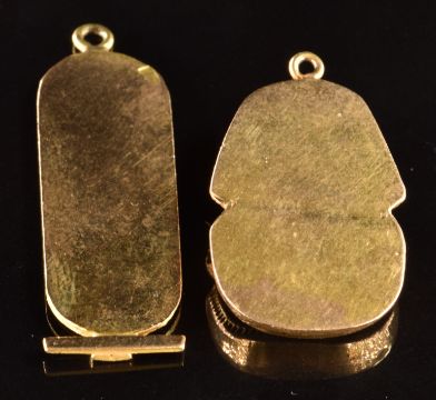 An 18k gold Egyptian pendant with hieroglyphic decoration and an 18k gold charm / pendant in the form of a pharaoh, 8.9g