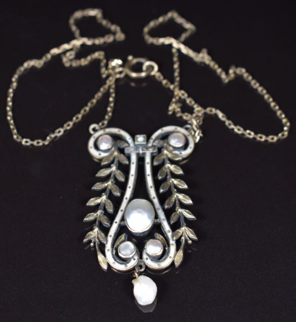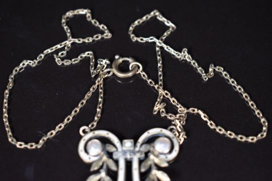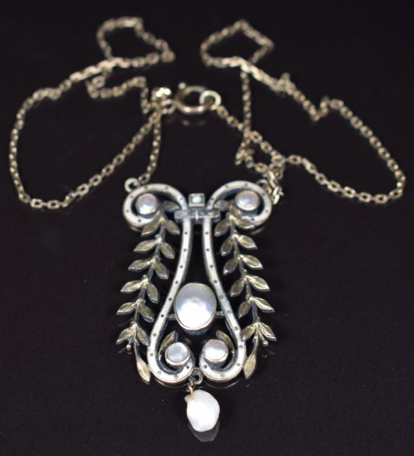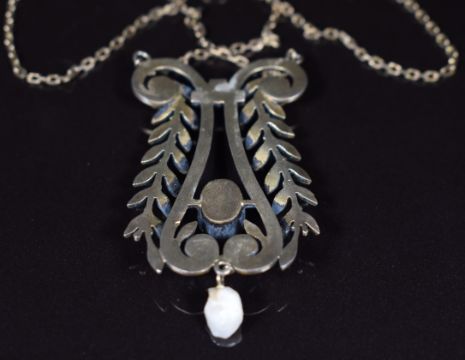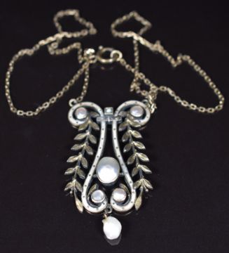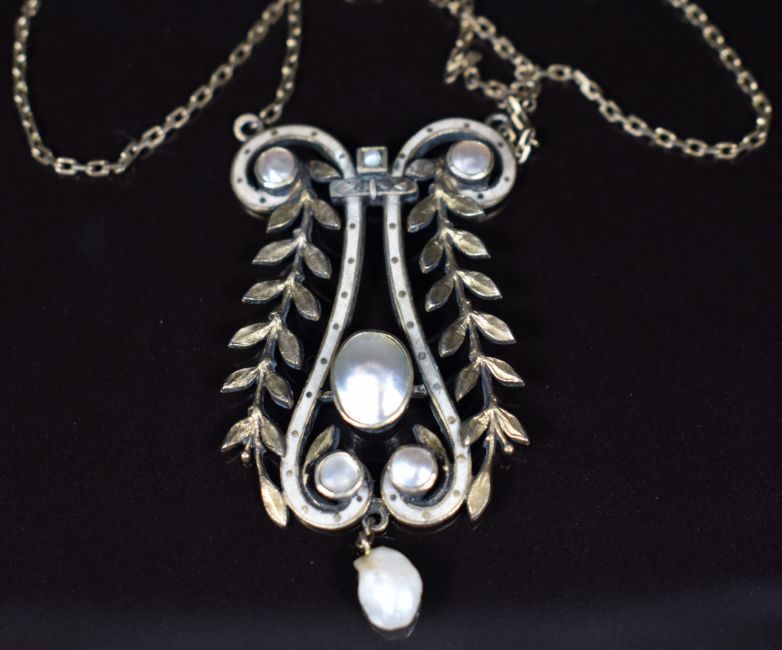 Austro Hungarian silver gilt necklace set with white enamel and pearls, 10.6g