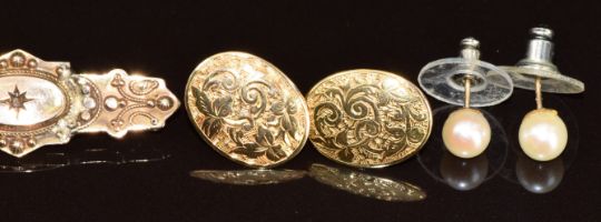 A 9ct gold brooch set with a diamond (1.9g), 9ct gold brooch set with an oval cut amethyst, 9ct gold earrings each set with a pearl and a pair of 15ct gold earrings converted from cufflinks (2.8g)