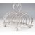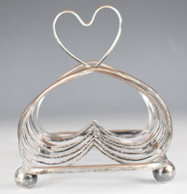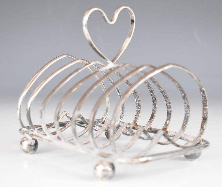 George V hallmarked silver seven bar toast rack with heart shaped hoops and handle, raised on ball feet, Birmingham 1910, maker W H Leather & Son, length 16cm, weight 313g