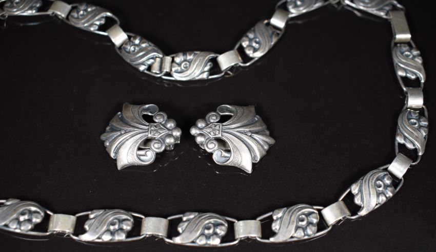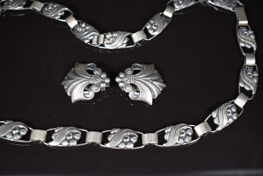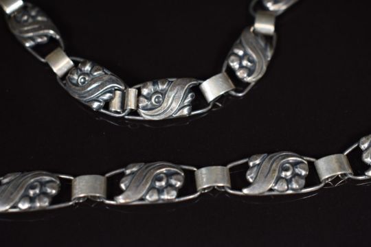 John Lauritzen Danish silver necklace made up of floral panels (42cm) and a pair of sterling silver earrings