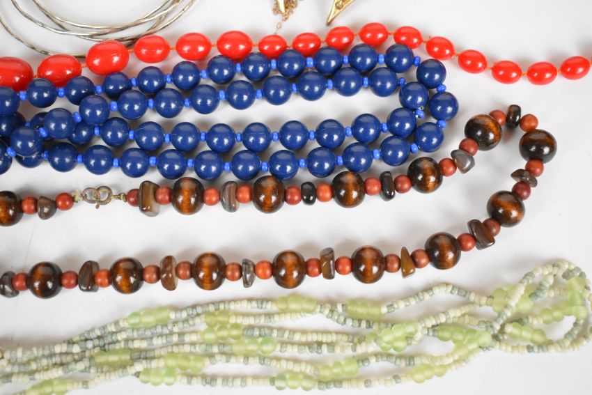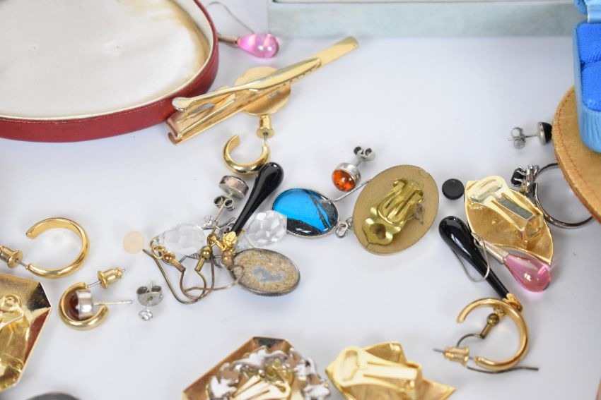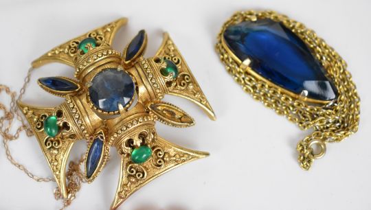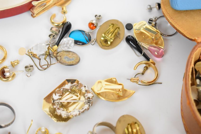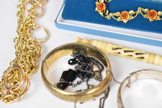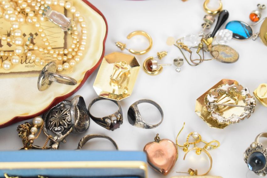 A collection of jewellery including Florenza brooch, Miracle pendant, Sphinx pendant, six silver bangles, nine silver rings, 9ct gold back and front heart locket, 9ct gold damaged chains (2g), etc