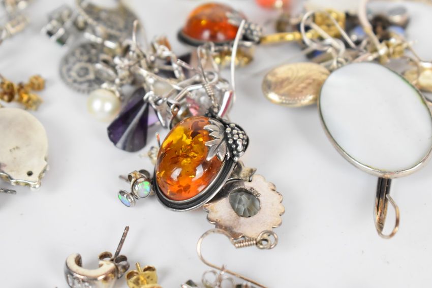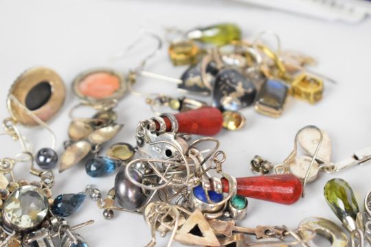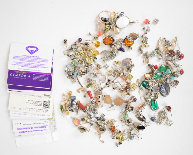 One hundred and ten pairs of silver earrings including pressed amber, zircon, tourmaline, topaz, cameo, emerald, peridot, etc., some with certificates , 370g