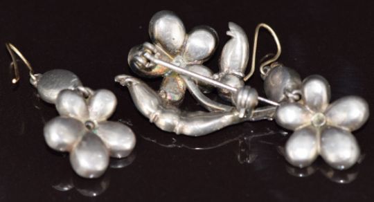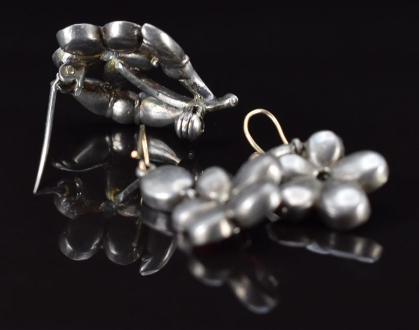 Georgian silver brooch and matching earrings in the form of flowers set with foiled garnets, 14.5g