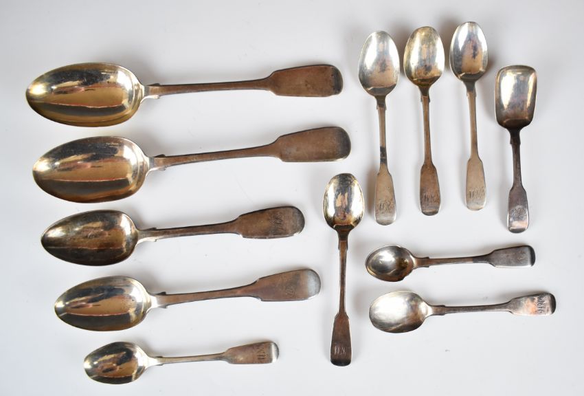 William IV and Victorian hallmarked silver Fiddle pattern cutlery comprising pair of table spoons, two dessert spoons, six teaspoons, caddy spoon and a further condiment or similar spoon, various dates and makers including some Exeter examples, length of longest 22cm, weight of all 368g