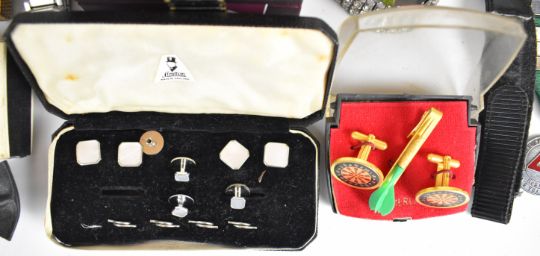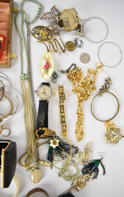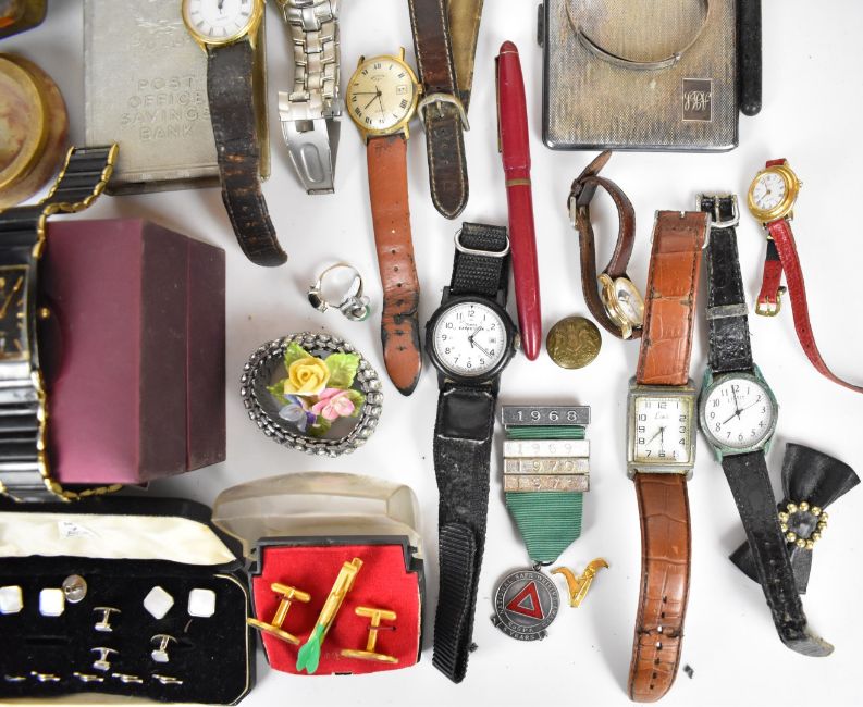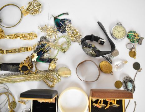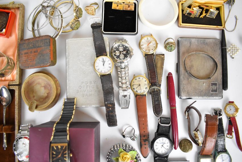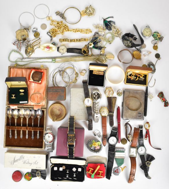 A collection of jewellery including silver bangle, vintage brooches, Smiths watch, cufflinks, etc