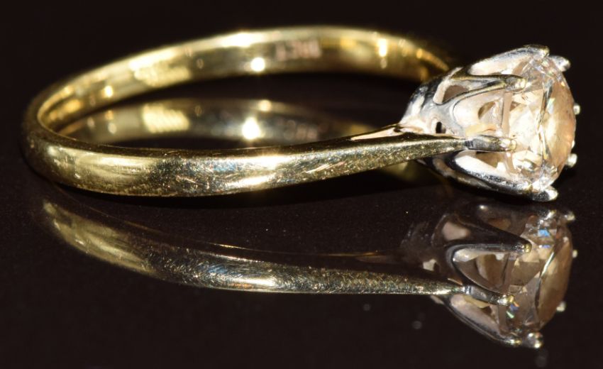 An 18ct gold ring set with a round cut diamond of approximately 0.85ct, 3g, size Q