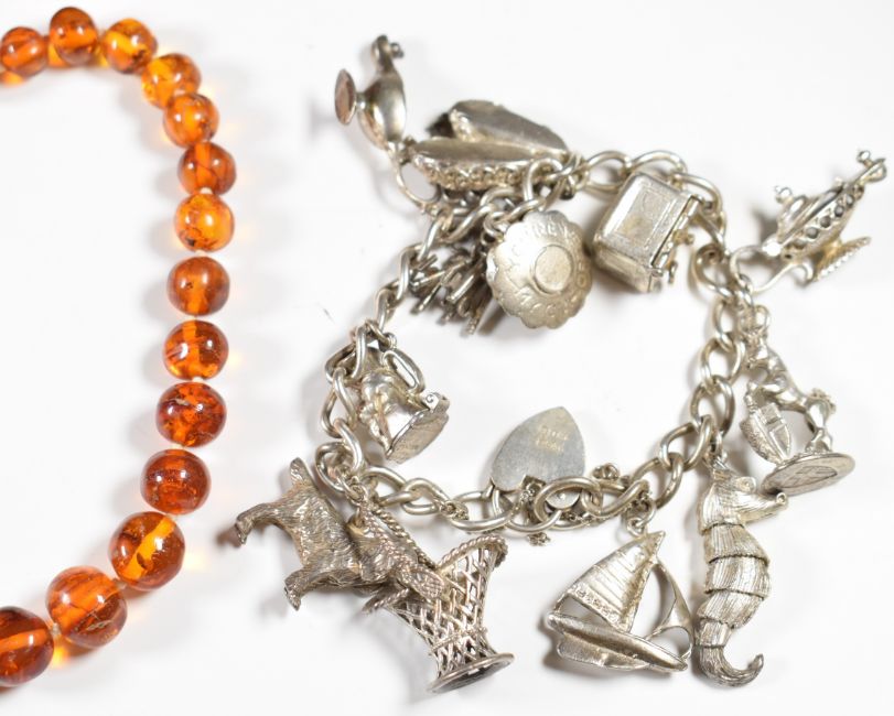 A collection of silver including charm bracelet with 12 silver charms including seahorse, dog, sailing boat, etc (69g), marcasite necklace, 9ct gold watch case, silver earrings, etc