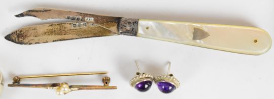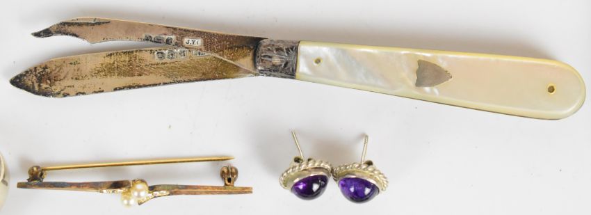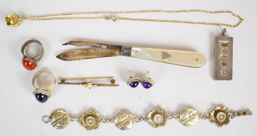A collection of silver including bracelet, two rings, earrings, penknife, ingot etc