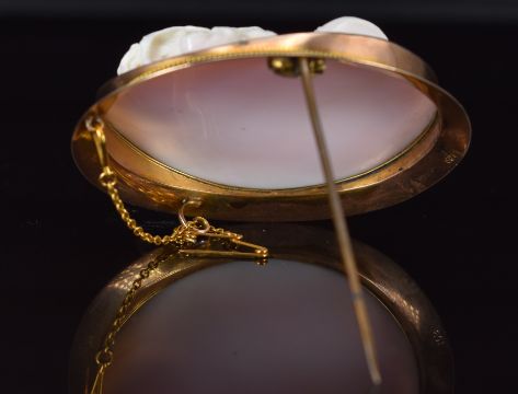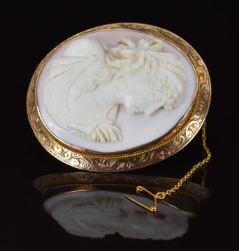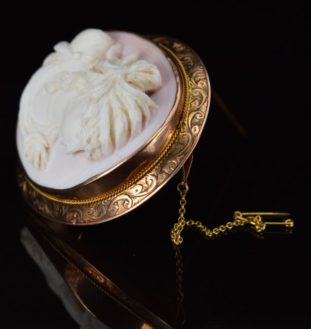 A 9ct gold brooch with scrolling decoration set with a coral cameo of a young woman, 28.5g, 5 x 5.8cm
