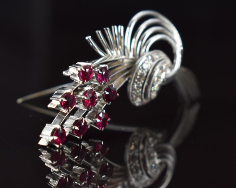 An 18ct white gold brooch in a stylised floral design set with eight round cut rubies, each approximately 0.15ct, and diamonds, 5.2cm, 11.4g