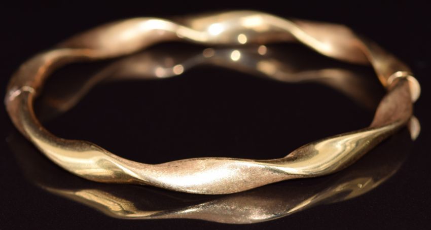 An 18ct gold bangle in a twist design with brushed finish, 8.9g, 5.9 x 5.2cm