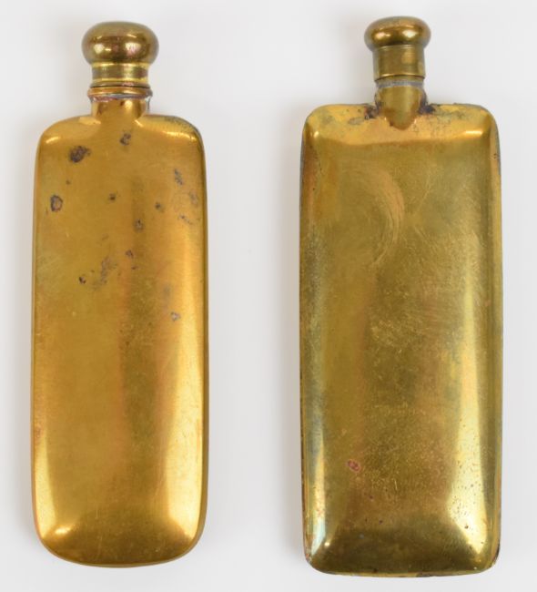 Four 19thC scent / perfume bottles including two guilloché enamel examples and two flattened form brass examples, tallest 7cm