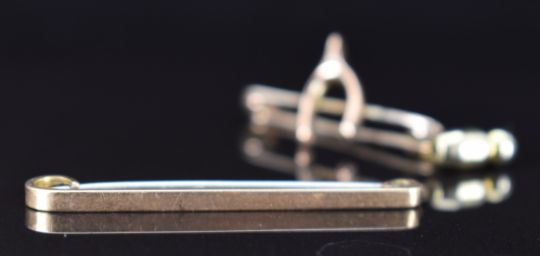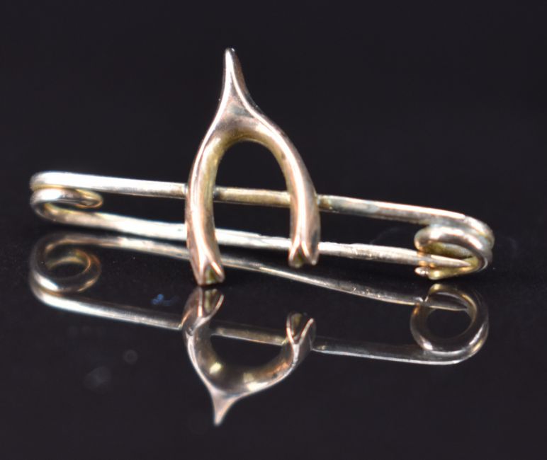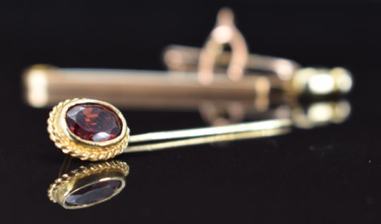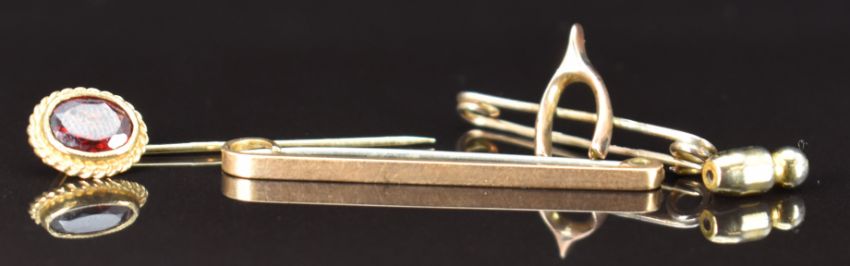 A 9ct gold brooch in the form of a wishbone, 9ct gold stick pin set with a garnet and a 9ct gold brooch, 3g
