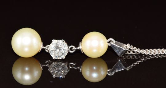 An 18ct white gold pendant set with a round cut diamond of approximately 0.8ct and two cultured pearls, measuring approximately 8.4mm & 9.6mm, 3.8cm, 3.2g