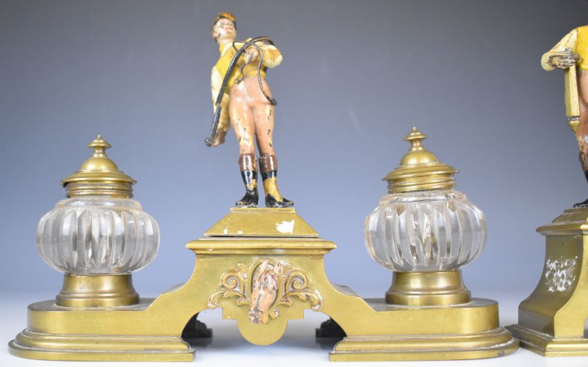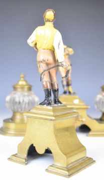 19th / 20th century novelty brass figural desk inkwell garniture with cold painted jockeys with whips and horse head decoration, the jockeys holding trophies forming candle holders, tallest 25cm