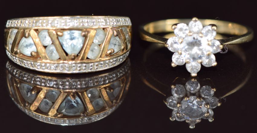 A 9ct gold ring set with topaz and diamonds and a 9ct gold ring set with cubic zirconia, 5.9g, sizes L & M