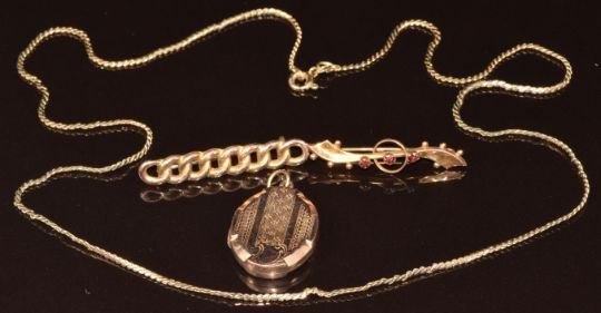 A 9ct gold chain, two 9ct gold brooches (6.5g) and a 9ct gold back and front locket