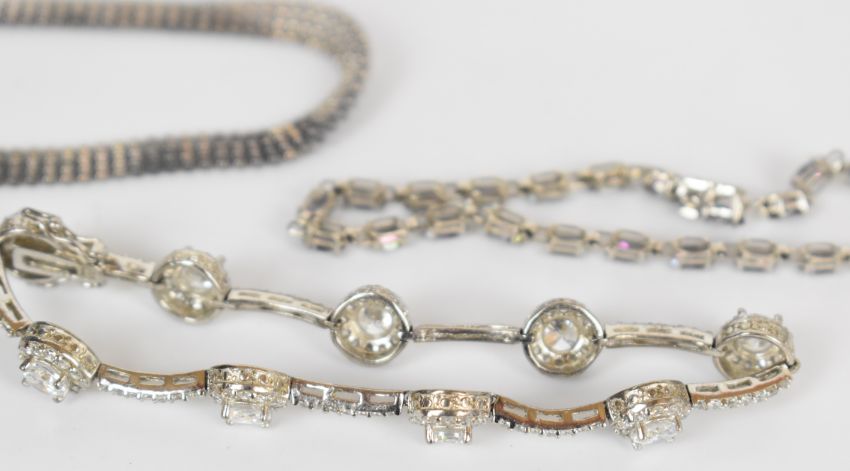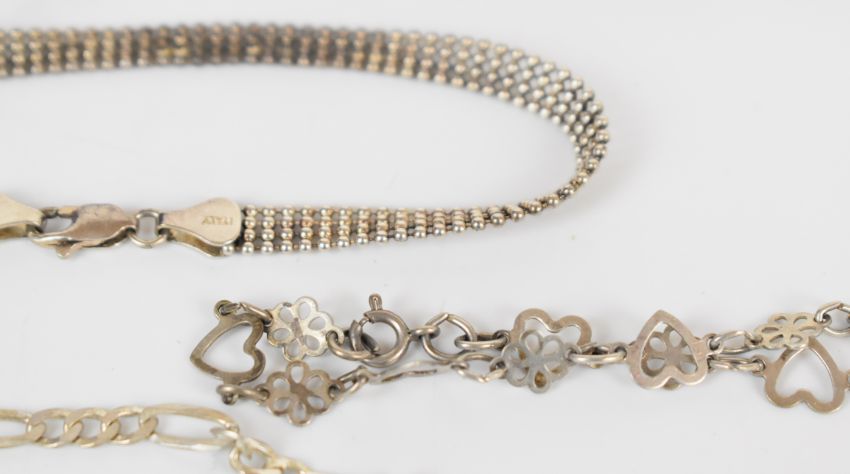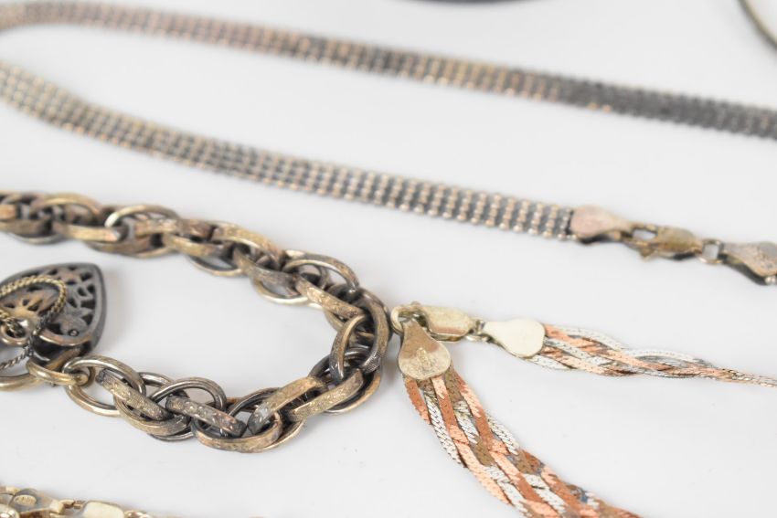 A collection of silver jewellery including bangles, fob watch, necklaces, bracelets, charm bracelet, etc