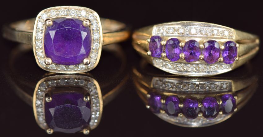 Two 9ct gold rings set with amethysts and diamonds, 6g, sizes T & U