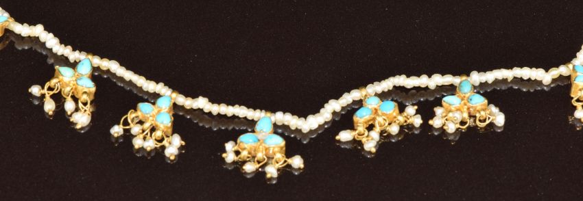 A c1900 single strand of seed pearls with 13 gold pendants set with turquoise and further seed pearls, 35cm, 7.1g