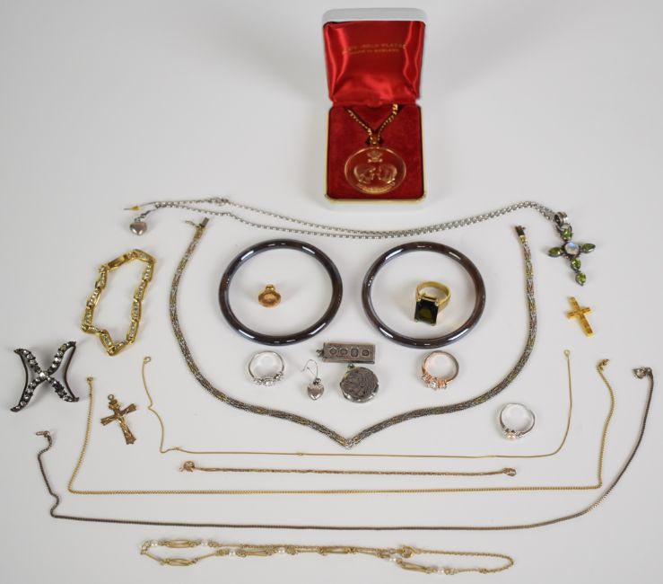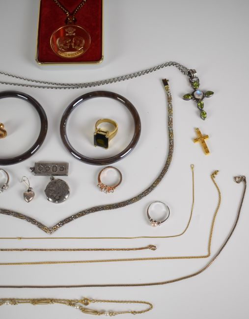 Collection of jewellery, some silver including two rings, an ingot, locket, pendant set with peridot and labradorite and necklace, and a 9ct gold bracelet, 9ct gold crucifix (2.3g), etc