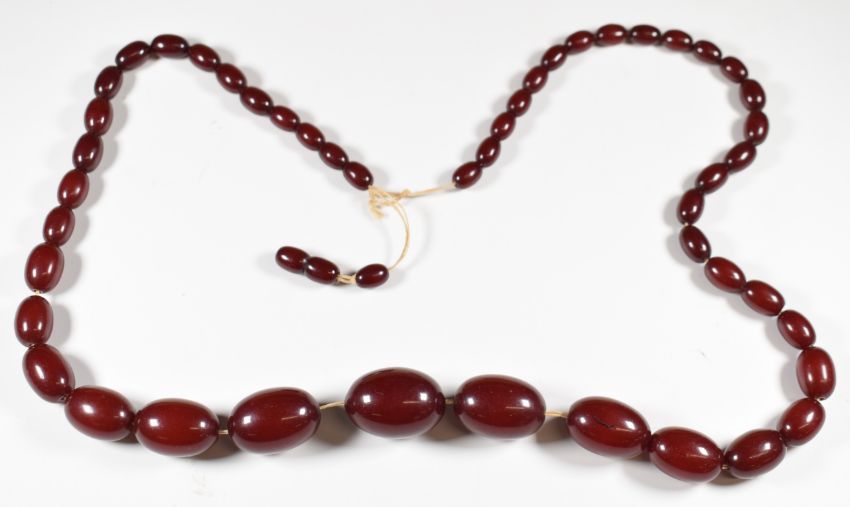 Cherry amber necklace made up of 48 graduated oval beads, the smallest 7 x 11mm and largest 21 x 29mm, 73g