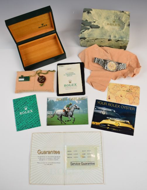 Rolex Oyster Perpetual Datejust gentleman's wristwatch ref. 16220 with date aperture, salmon or peach dial, gold Roman numerals, luminous gold hands, stainless steel case and signed 31 jewel calibre 3135 movement, on stainless steel bracelet, case diameter 36mm, serial number 4483985, 1976, in original box with outer box and paperwork (some unrelated).