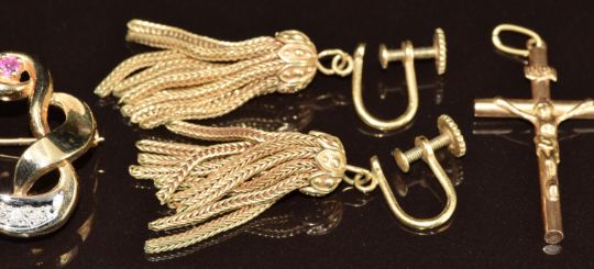 A 9ct gold brooch set with pink sapphires and diamonds, 9ct gold crucifix (6g) and a pair of yellow metal tassel earrings