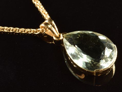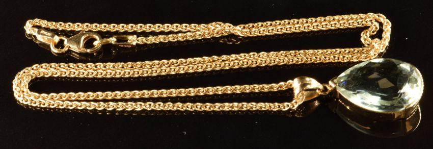 An 18ct gold pendant set with a pear cut aquamarine (2.5cm) on 18ct gold chain (44.5cm), 10g