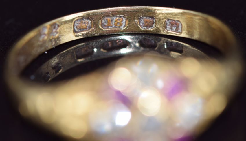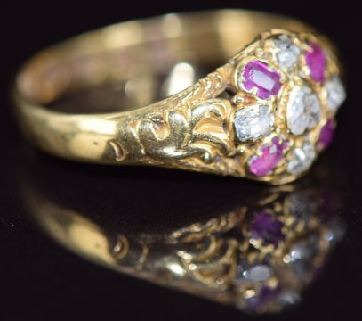 An 18ct gold ring set with pink sapphires and diamonds, London 1868, 2.5g, size N