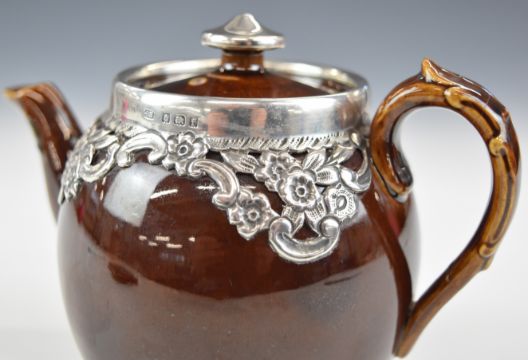 Edward VII hallmarked silver mounted ceramic teapot, the floral mount Birmingham 1905, maker Henry Bourne, length 16.5cm