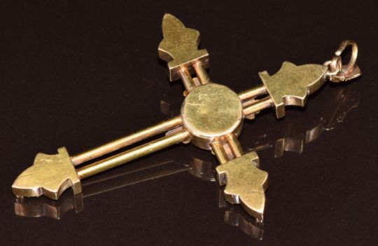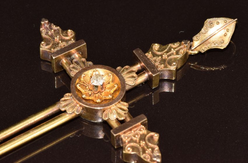 Victorian Etruscan Revival yellow metal cross with wirework decoration and set with an old cut diamond, 10.7g, 8 x 5cm