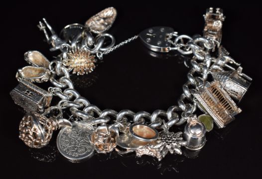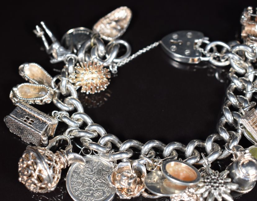 A silver charm bracelet with nineteen silver charms including hedgehog, Nuno flower opening to reveal a bee, shamrock set with coromandel, car, etc, 132g