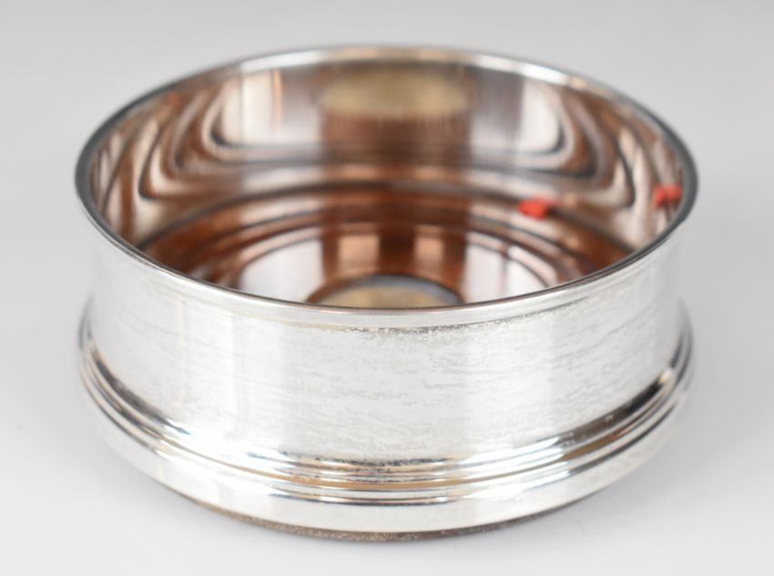 Modern hallmarked silver mounted wine bottle coaster, pair of modern feature hallmarked ice or similar tongs, length 13.5cm, hallmarked silver mother of pearl handled bookmark and a hallmarked silver salt spoon, weight of tongs and spoon 45g