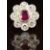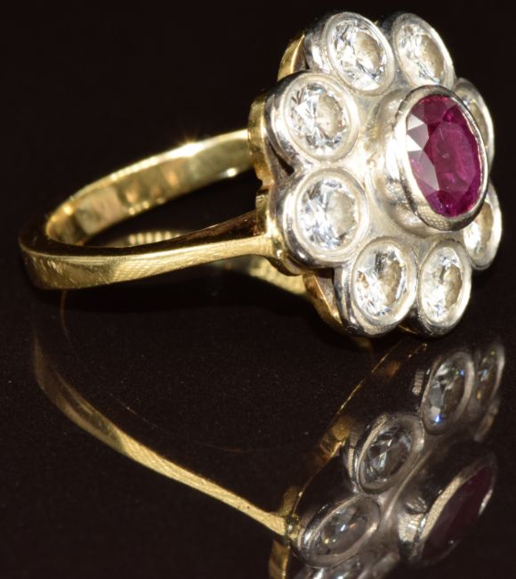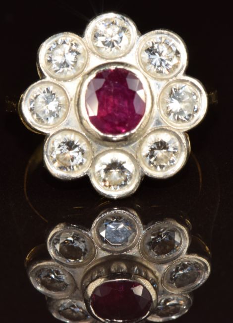 An 18ct gold ring set with an oval cut ruby of approximately 0.8ct surrounded by eight diamonds, each approximately 0.21ct, 7.8g, size K
