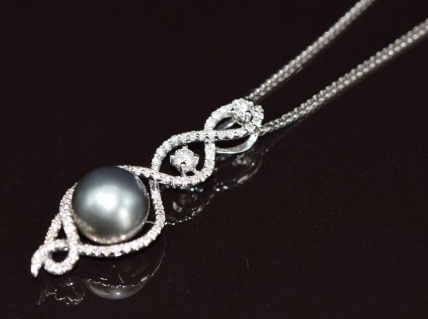 An 18k white gold pendant set with a Tahitian pearl (10.6mm) and diamonds in a twist setting, on 18k white gold chain, 6.9g