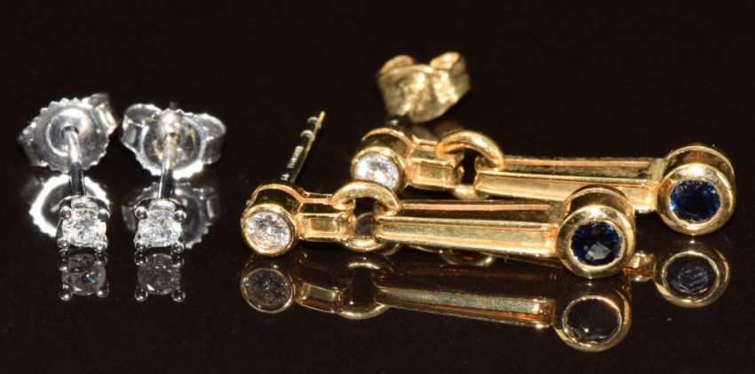 A pair of 9k white gold earrings each set with a diamond (0.4g) and a pair of 18k gold earrings each set with a sapphire and diamond (3.2g)