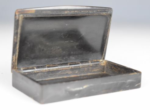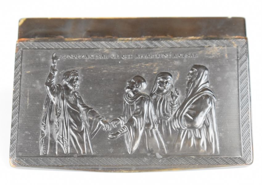 19th century carved horn snuff box with Biblical scene and phrase above 'rendez à césar ce qui appartient à césar', length 9.5cm