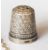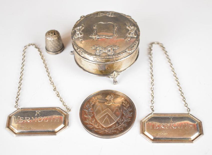 Hallmarked silver items comprising Art Nouveau hallmarked silver dressing table pot, Pleasance & Harper thimble and a pair of Vermouth bottle tickets or labels, together with an unmarked medallion awarded to J. Inkpen and dated 1891
