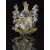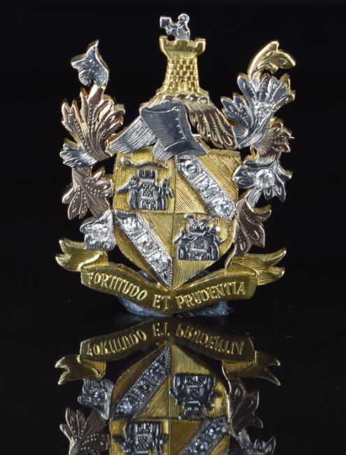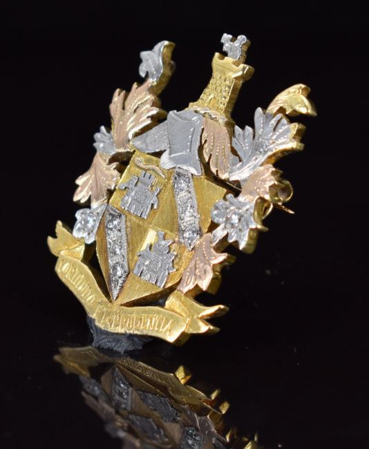A c1930 18ct gold tri-coloured brooch in the form of a crest engraved 'fortitude et prudentia' and set with nine diamonds, 30.6g, 4.2 x 3.1cm