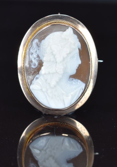 A c1900 9ct gold brooch set with a cameo of a woman, 6.7g, 3 x 3.8cm