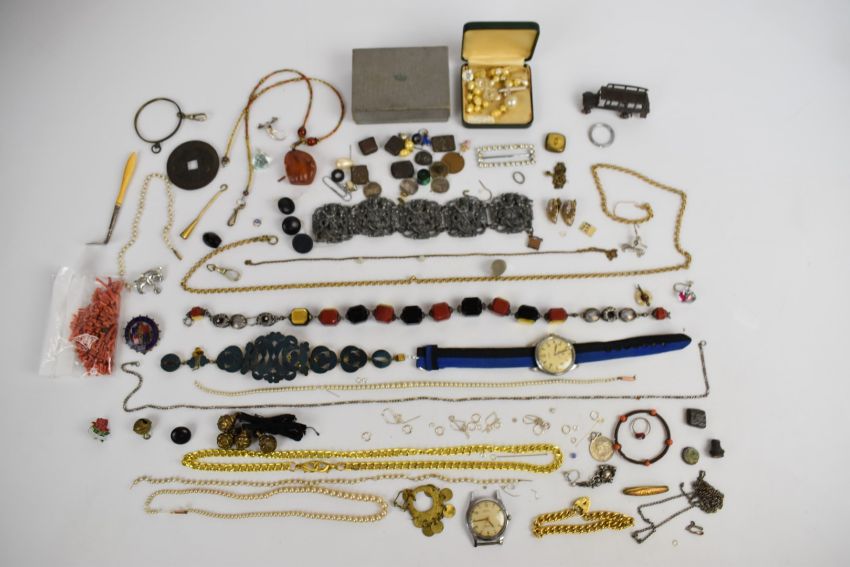 A collection of jewellery including two strands of faux pearls with 9ct gold clasps, Cyma watch, antique bracelet, Audax watch, rolled gold curb link bracelet, silver chain, etc