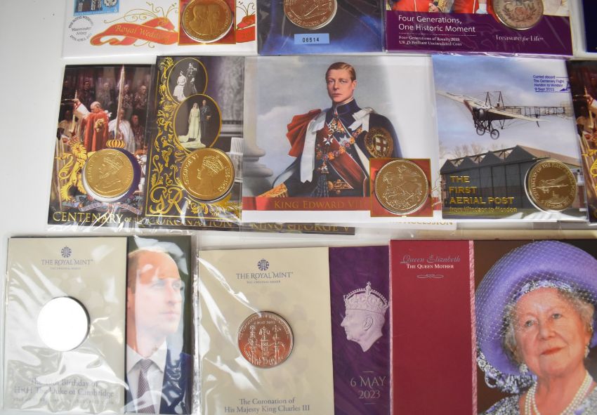 Twenty largely Royal Mint coin packs including Royal commemoratives to include Charles III, Edward VIII, George V, William and Kate, Queen Victoria, etc and some stamp / coin covers