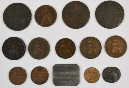 A group of interesting copper coinage to include a Roman radiate head example, 1673 Charles II farthing, William III halfpenny, William IV, 1943 church token etc